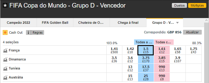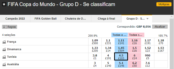 Nesse Grupo D, o favoritismo é mesmo indiscutível, tal como se pode perceber pela odd das Casas de Apostas relativas à chance de a França vencer a chave.