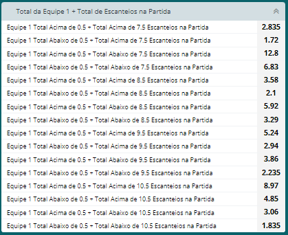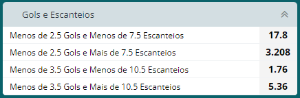 Nesses mercados para apostas em resultados acumuladores, surge, em uma só linha, uma opção para apostas em mercados de gols junto com uma opção para apostas em mercados de escanteios.