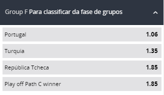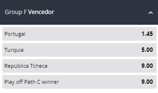 A República Tcheca, terceira integrante dessa chave já conhecida, surge atrás de Portugal e Turquia com uma no valor de 1.85, igual à da seleção que ainda não é conhecida e mais tarde se juntará a essa chave.