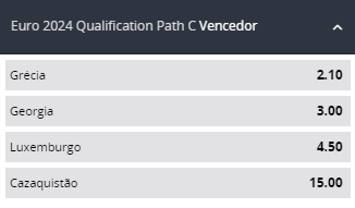 O Luxemburgo, terceiro da lista, também parece ter algumas chances de classificação, mas já o acesso do Cazaquistão (@15.00) seria uma enorme surpresa. Vale lembrar que essas duas seleções – no caso do Cazaquistão, como nação independente – nunca participaram de uma fase final da Eurocopa, assim como a Geórgia após a independência da URSS.