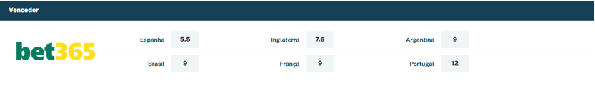 A campeã europeia Espanha (@5.50) e a “vice” Inglaterra (@7.60) partem na frente, com Argentina (@9.00), Brasil (@9.00) e França (@9.00) como principais ameaças.