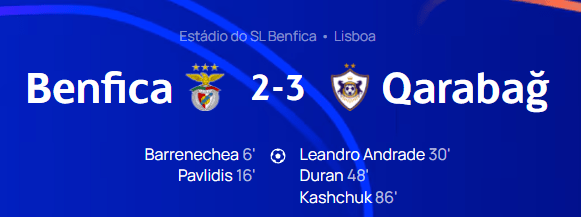 Em um dos maiores choques da primeira rodada da prova, o Qarabag, a cumprir somente sua segunda participação da fase final da Liga dos Campeões, foi à Luz vencer o Benfica por três a dois.