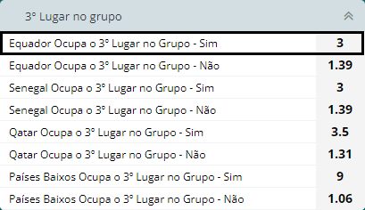 Caso queira realizar apostas no grupo A, a chance de o Equador terminar no terceiro posto dessa chave está cotada a 3.00 na 1xBet.