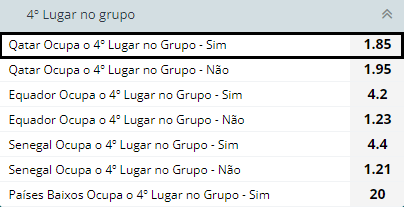 A possibilidade de o Catar terminar no quarto lugar da chave está cotada a 1.85 na 1xBet.