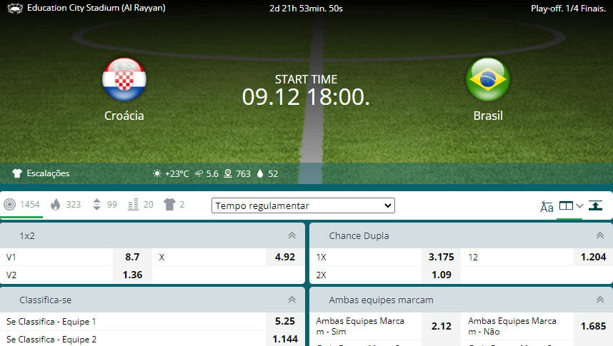 Na 22Bet, uma vitória brasileira no tempo normal está cotada a 1.36, enquanto a odd para conseguir a classificação para a etapa seguinte é de 1.14.