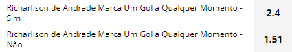 O astro do Brasil tem uma cotação de 2.20 associada para marcar a qualquer altura, seguido de perto por Richarlison com 2.40. Neymar se estrou a marcar de pênalti frente à Coreia do Sul (falhou as partidas com Suíça e Camarões por estar machucado), enquanto Richarlison é o artilheiro da “Canarinha” com três gols.