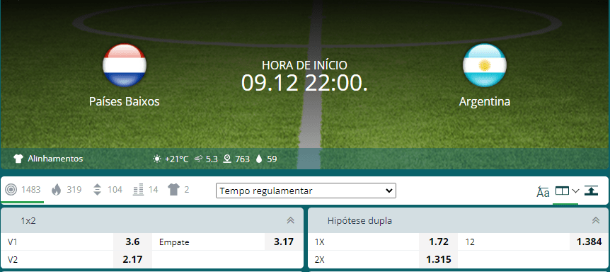 Na 22Bet, a vitória argentina no tempo normal está avaliada a 2.17, enquanto o triunfo dos Países Baixos está a 3.60.