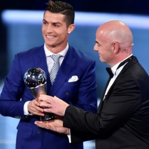 Cristiano Ronaldo com o Prêmio The Best dado por Gianni Infantino.