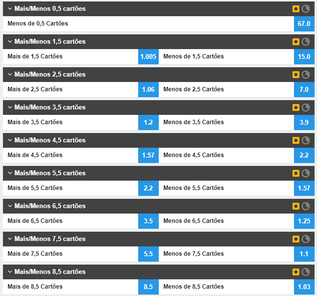 Abaixo poderá encontrar um exemplo de mercado para apostas em cartões em um jogo da Premier League, disponível na Betfair.