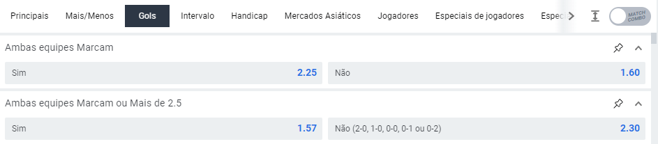 Existem várias opções nos mercados de gols, desde o ambas marcam como pode ver no exemplo abaixo, aos intervalos de gols ou até mesmo ao número de gols em cada uma das partes.