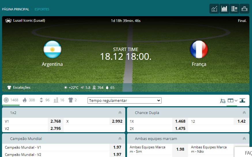 Nesse levantamento das cotações para a final da Copa do Mundo, optámos por conferir as odds em sua versão Sportsbook, ou seja, na plataforma que funciona como uma Casa de Apostas convencional.