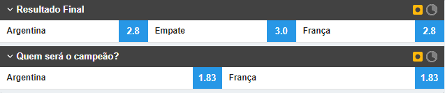 Já no tempo normal, o favoritismo pende ligeiramente para o lado da equipe da Argentina com uma odd de 2.768 contra 2.795 da França.