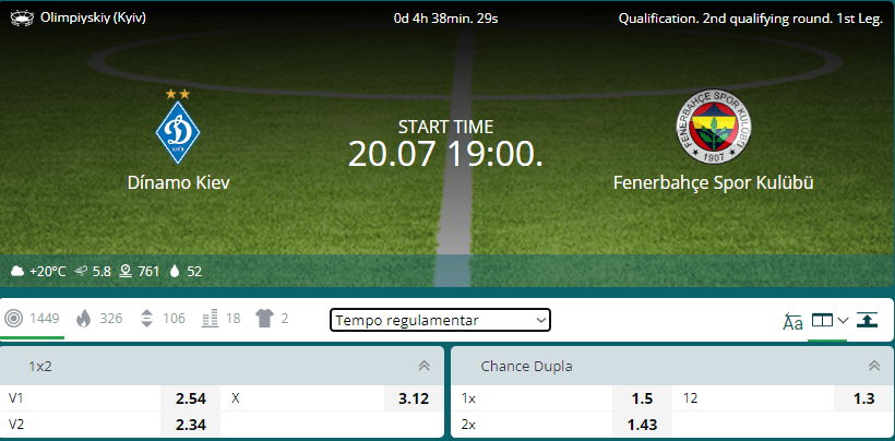 Nesse partida de futebol entre Dínamo de Kiev e Fenerbahçe, as cotações da 22bet estão dispostas da seguinte forma no mercado 1×2: