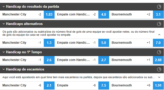 Seguindo a lógica anterior, está claro que os “Citizens”, favoritos, vão ter um Handicap Negativo associado. Já os “Cherries”, não favoritos, têm Handicaps Positivos associados.