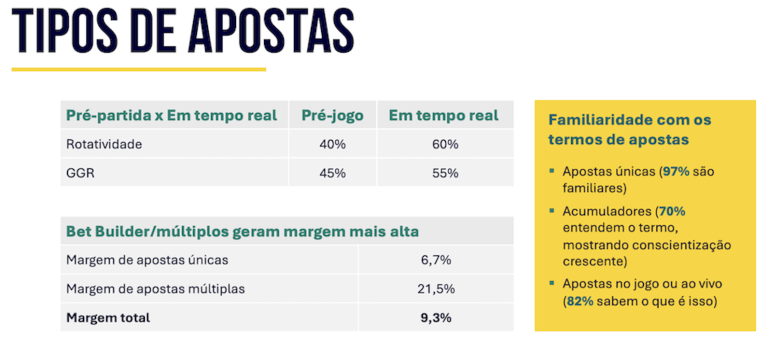 Como informação complementar, a consultora apresenta alguns dados relativos à familiaridade com os termos de apostas, indicando que 97 por cento dos inquiridos estão familiarizados com o conceito de apostas únicas, 70 por cento entendem o termo “acumuladores”, mostrando “conscientização crescente” e, por fim, que 82 por cento sabem o que são aposta no jogo ou ao vivo.