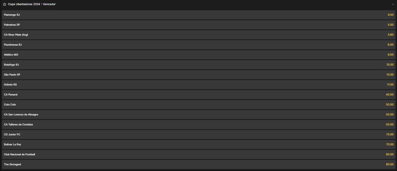 Após os favoritos “Mengão” e “Verdão”, o Fluminense, com cotação de 8.00, é o terceiro time brasileiro melhor colocado. Atlético Mineiro (9.00), Botafogo (10.00), São Paulo (13.00) e Grêmio (18.00) surgem imediatamente a seguir.
