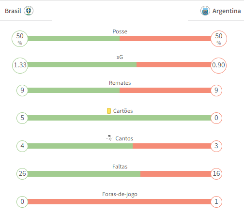 Estavam reunidas todas as condições para um encontro difícil para a equipe de arbitragem e assim acabou por se verificar: ao todo, foram assinaladas 42 (!) faltas, 26 cometidas por jogadores brasileiros, 16 por argentinos. A Argentina acabou vencendo o jogo e, já no desespero, Joelinton foi expulso do lado do Brasil. Abaixo poderá encontrar as estatísticas desse jogo disponibilizadas pela plataforma FootyStats.